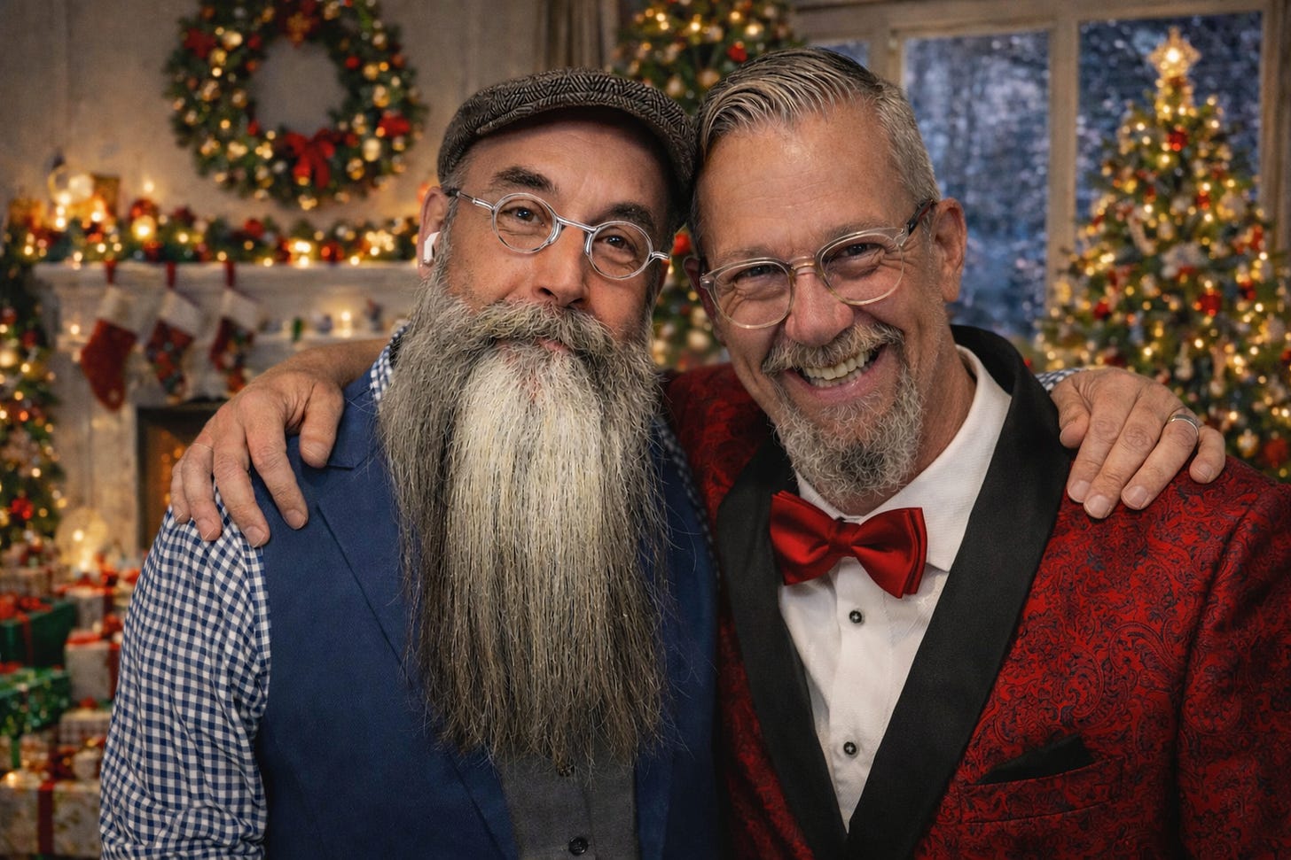 [the photo accompanying this piece was created using Chatgpt, merging two images… one of me and one of Peter. The holiday attire was added to Peter. And I think he looks stunning!]